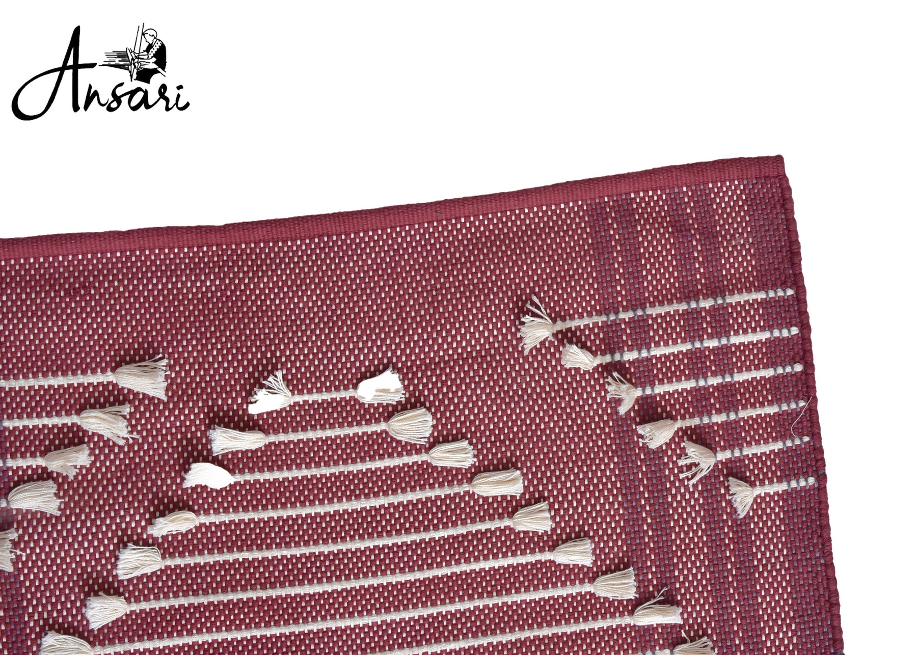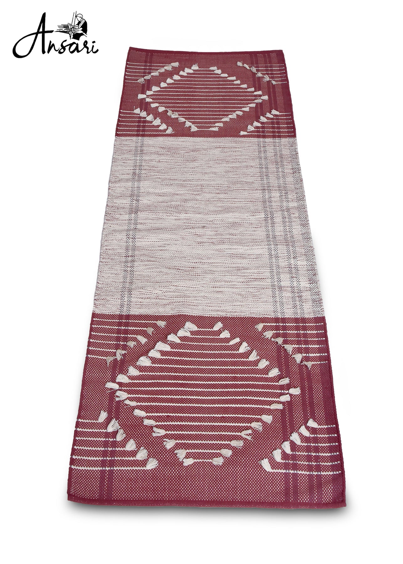 • Elevate your space with the bold Maroon Geometric Yoga Mat This mat features a rich maroon-red color accented by large, intricate white diamond and triangle patterns at both ends, framing a smooth, light-colored center. Perfect for adding a stylish, artistic touch to your practice or as a decorative runner.